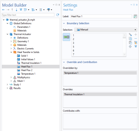 If a physics node is disabled locally in a study step using the Physics and Variables Selection section in the study step’s Settings window, the indications of overrides and contributions in the Model Builder are unchanged (but disabled physics nodes get an asterisk to indicate that their state has been changed in at least one study step). However, the local variables and physics tree in the study step’s Settings window displays the overrides and contributions taking the disabled nodes into account.