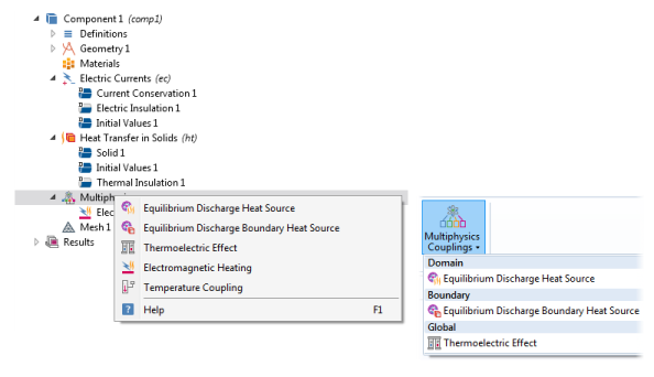Multiphysics node is automatically added to the Model Builder. The relevant predefined multiphysics coupling features are then available from the context menu (right-click the