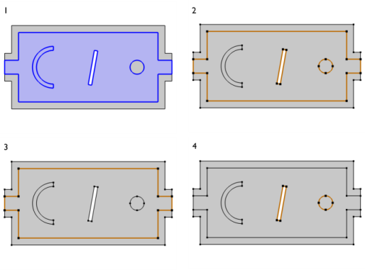 Adjacent points to use the boundaries, edges, or points next to the selected domains as the selection output (available options depend on the space dimension of the Component). If the output entities have a lower dimension than the input entities, there are also options to select exterior and interior entities of the union of the input selections. This makes it possible to, for example, make a selection of all boundaries around a domain by first selecting the domain.