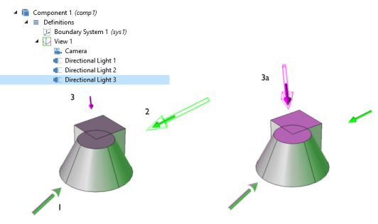 By default, the Lock to camera coordinate system checkbox is selected to make the light rotate together with the camera. Click to clear as needed; the light then follows the geometry.