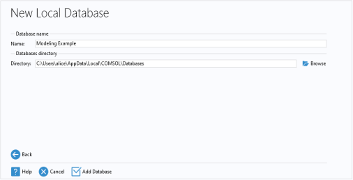 In the New Local Database window, write Modeling Example as the name for the new database in the Name field.