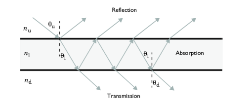 θu is measured with respect to the surface normal so it corresponds to the polar angle with the semitransparent surface. The angle of the ray within the material is noted