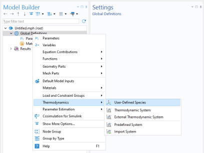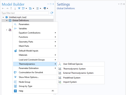 Select Thermodynamic System in the context menu to add a thermodynamic system that uses the built-in database included with COMSOL Multiphysics.