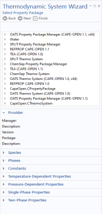 All installed packages, from providers such as COCO/TEA, Aspen Properties, and so on, are available in the Thermodynamic System Wizard (