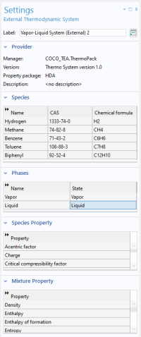 Selecting the External Thermodynamic System node shows the thermodynamic system settings with sections for available species, phases, species properties, and mixture properties. Editing the text in the Label text field changes the name of the system. Below follows a description of the thermodynamic system settings.