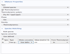 Mixture Properties section. Here you can match the variables for the concentrations, and by this calculate mixture properties (transport and thermodynamic properties). For information on how to specify the dependent variables to be used, see