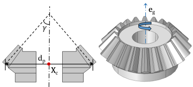 The additional parameter cone angle (γ) is required to define a bevel gear. The positive cone angle results in a decrease in diameter along the gear axis.