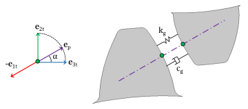 In this node, the transmission error (elasticity), θel, is a degree of freedom. This transmission error is added in the rotation constraint of the gear pair.
