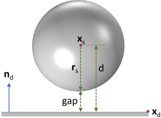 The shortest distance between the spherical source and the planar destination (d) is the projection of the distance between source center and a point located on the plane in the direction of the surface normal. It is calculated as