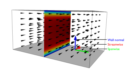3 refer to the streamwise, wall normal, and spanwise directions, respectively. The streamwise direction is parallel to the fluid velocity. The wall normal direction points away from the nearest surface with a