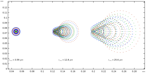 After tracing rays in 3D, you can plot the intersection points of rays with a surface using the dedicated Spot Diagram plot. This plot can only be added to a