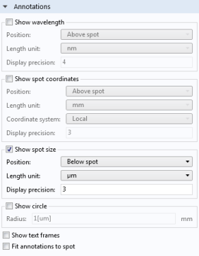 The Annotations section can add text above or below the spots in the Graphics window. These annotations can show the position, rms spot size, and wavelength (or wavelength range) of each spot. There is also an option to draw a circle in the plot, which could be used to draw the Airy disk for scale.