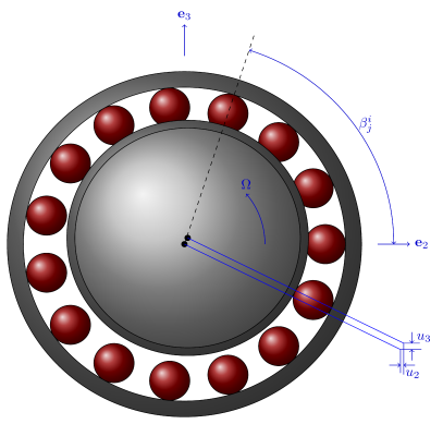 er is the contact direction between the rolling element and the races. Because races of a bearing are connected to the rotor and the foundation, respectively, the displacement of the inner race is equal to the rotor displacement, and the displacement of the outer race is equal to foundation displacement. As you can see, for single row bearings, the preload is also transmitted to the rotor on which the bearing is mounted.