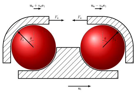 Let us assume that the outer race is split and that the part corresponding to the first row moves by an axial displacement ua along the bearing axis, and that the part corresponding to the second row moves by the same axial displacement but in opposite direction. The weak contribution due to the axial preload, in this case, is