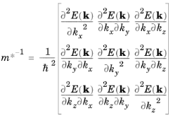 which is identical in form to the Schrödinger equation, except that the effective mass rather than the electron mass appears in the equation system. It is important to remember that for Equation 3-37 to apply the E–k relationship must be defined in an appropriate coordinate system. Note, however, that for the case of an anisotropic effective mass there are different coefficients for the derivatives in different directions in the Laplacian operator.