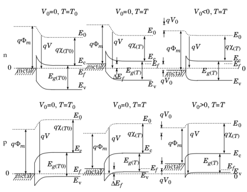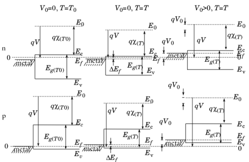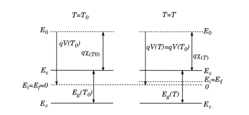 Figure 3-12). Since the vacuum level adjusts to accommodate the space charge layers that are created in the device, it does not remain constant when the temperature is changed away from equilibrium. For an intrinsic semiconductor, however, the vacuum level remains constant when the temperature is changed. This is shown in