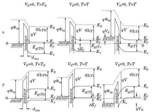 The band diagram for a thin insulating gate is shown in Figure 3-15. As for the ohmic contact, a change in the temperature of the device away from the equilibrium reference results in a shift of the metal and semiconductor Fermi levels (