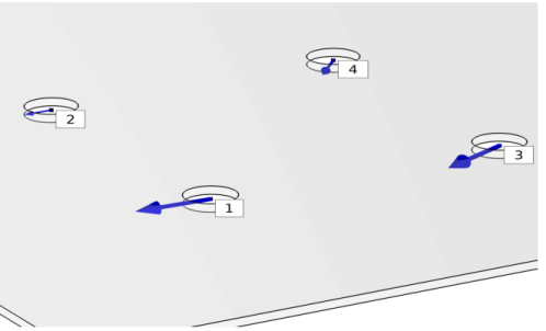 A Fasteners Forces plot group, to visualize the normal and shear forces at each fastener, and a label showing each fastener number. Normal forces are plotted as green arrows, and shear forces as blue arrows. The coloring can be affected by the addition of a Safety subnode. To display the fasteners forces, these have to be evaluated first using the Fasteners Normal Forces and Fasteners Shear Forces evaluation group.