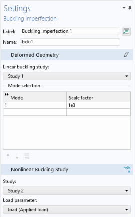 Under Mode selection, add the buckling modes to include in the Mode column. Also, specify a scale factor for each mode in the corresponding field under Scale factor.
