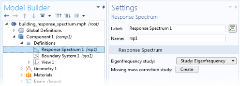 A Response Spectrum node is added under Definitions in the first component which contains at least one structural mechanics physics interface. In this node, the Eigenfrequency study list will be initialized to point to the Eigenfrequency study step that was just created.