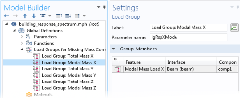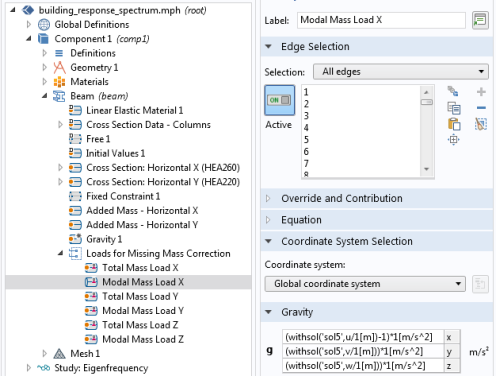 In each structural mechanics physics interface in the component, a set of Gravity nodes are added. There are two such nodes for each spatial direction. Each gravity node is connected to a corresponding load group. Half of the loads are pure gravity loads, used when only together with the Static ZPA method. The other set of loads, which are used in the Missing mass method, are referencing the combined solutions as the depend on the computed eigenmodes. The gravity nodes are placed under a common group, named Loads for Missing Mass Correction.