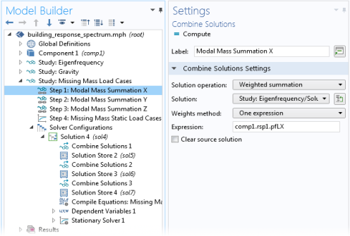 A new study named Study: Missing Mass Load Cases is created. This study contains three or four study steps, depending on the space dimension. First, there is one Combine Solutions study step for each spatial direction. In these steps, a weighted sum of the eigenmodes is computed. The weights are the modal participation factors in each direction. This gives a measure of the mass that the eigenmodes represent. These study steps must reference the eigenvalue solution, including any subsequent filtering. If you change the study from which the eigenmodes are to be taken, you must also change the choice in the Solution list in all of the Combine Solutions nodes. The final study step in the study is a stationary study step, where each load group is solved separately by adding one load case per load group.