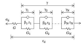 The auxiliary strain variables γm are introduced to represent the extension of the corresponding Kelvin–Voigt element. Since the elements are arranged in series, the total viscoelastic strain is given as the sum of the auxiliary strains