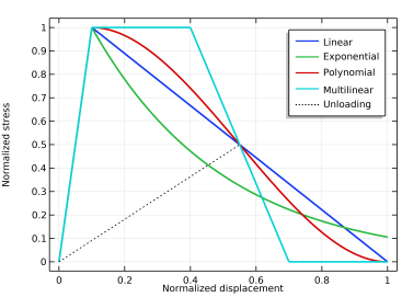 The Multilinear option specifies a damage evolution function that gives a traction–separation law that is linear up to the interface strength. Thereafter a region of constant stress is introduced before the interface softens linearly as seen in