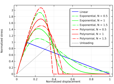 The Exponential option specifies a damage evolution function that gives a traction–separation law which is linear up to the interface strength, and thereafter softens with an exponential curve that asymptotically reaches zero as shown in